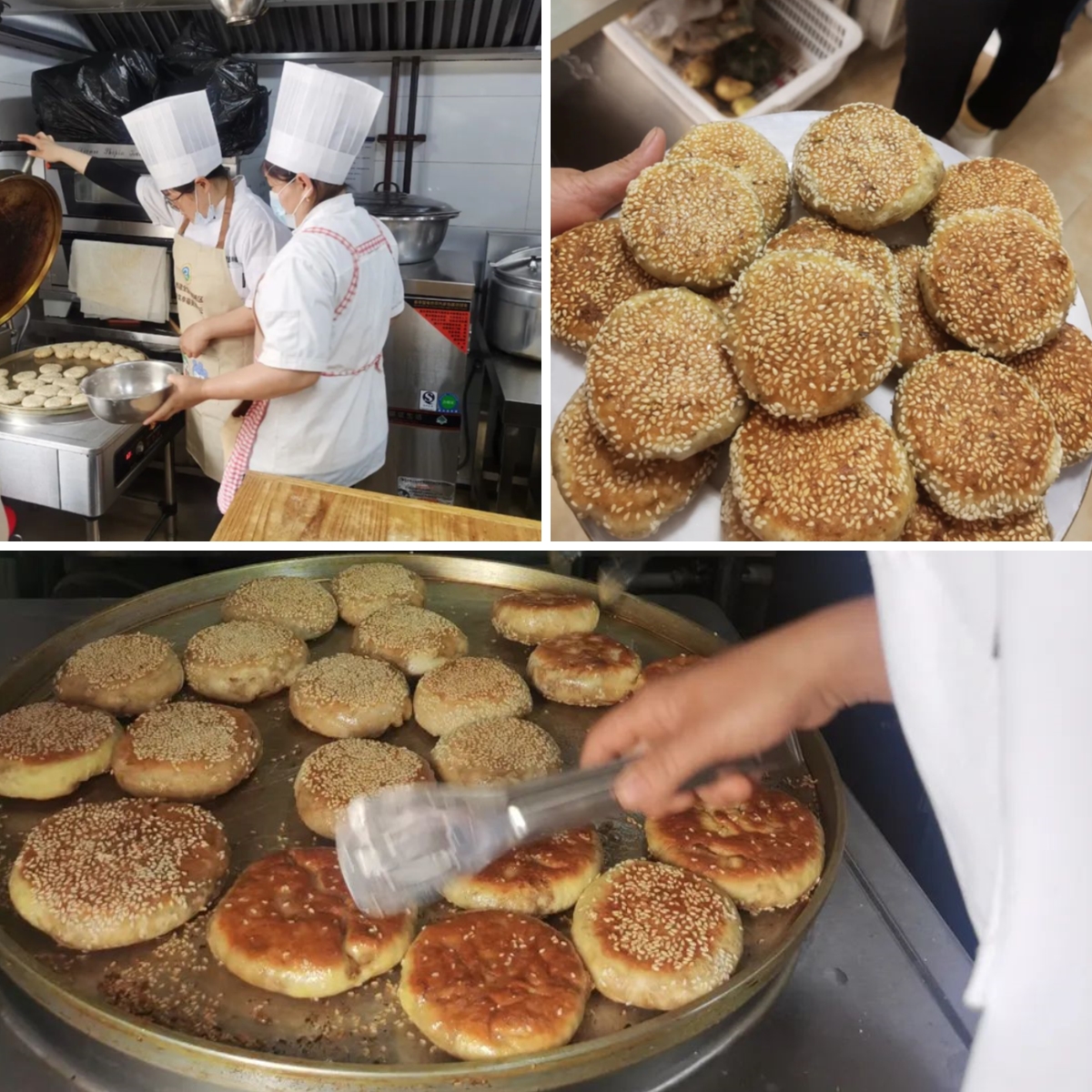 芝麻小烧饼制作 本次比赛分两个环节:制作芝麻小烧饼和千层饼。在制作过程中,选手们展示了自己精湛的手艺,娴熟的操作:和面、醒面、擀、揪、揉一气呵成,令评委们赞叹不已。在她们的精心制作下,雪白的面粉摇身一变,成为一张张色泽油亮,香气四溢,外酥里嫩,香甜可口的家常饼。评委们分别根据“色、香、味、形”对各位选手的作品进行综合评价。最终评选出两名获胜选手。同时,对其他选手的作品也给予了充分的肯定。